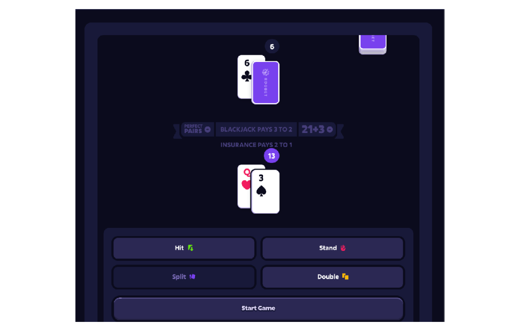 To place a bet in Blackjack, you need to have money in your Roobet wallet. Input how much you wish to stake on the main bet. Click ‘Start Game’ to have the cards dealt, officially starting your turn. Side bets on Perfect Pairs and 21+3 are optional. You may input bets there, too, before clicking ‘Start Game’, but the main bet is mandatory.